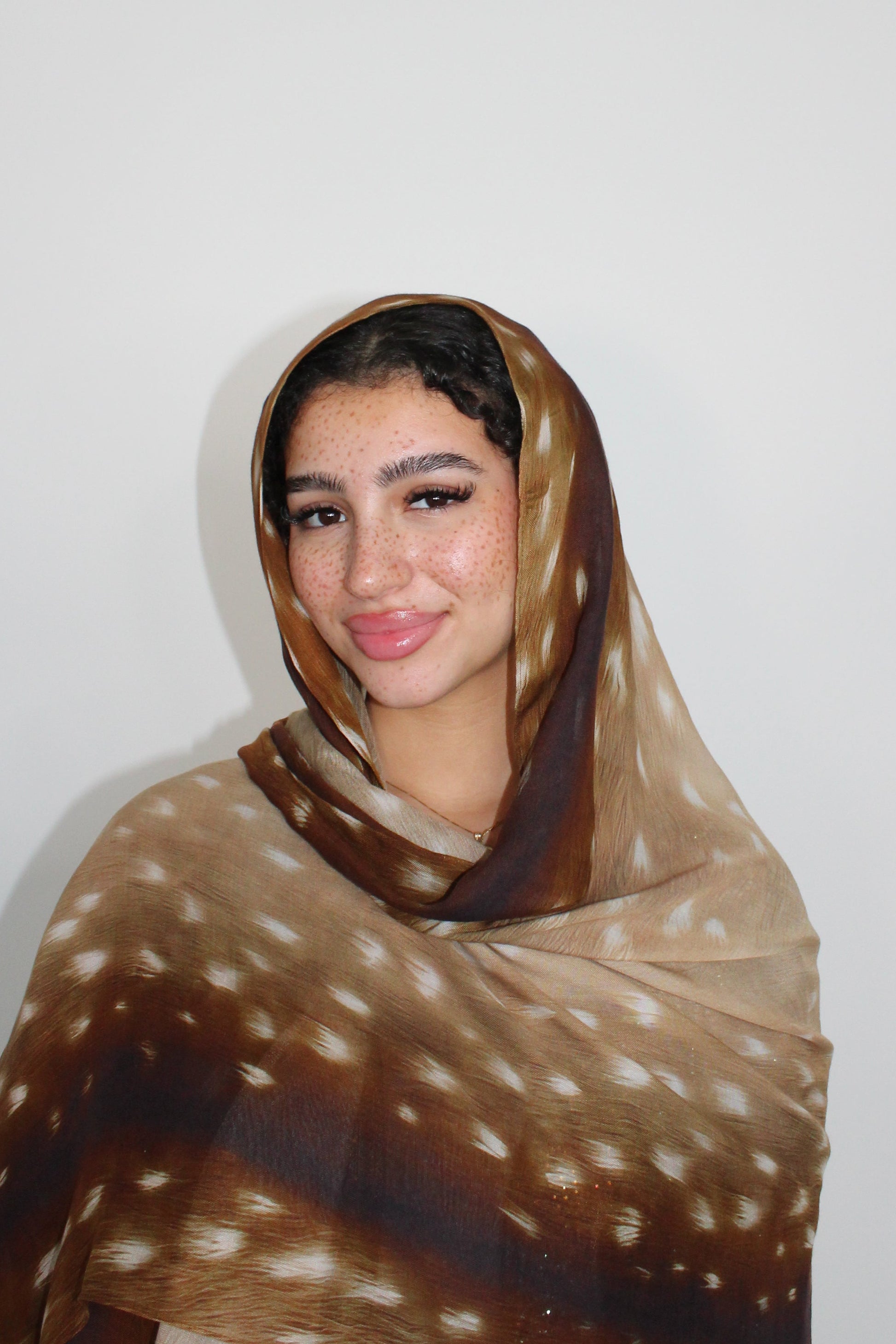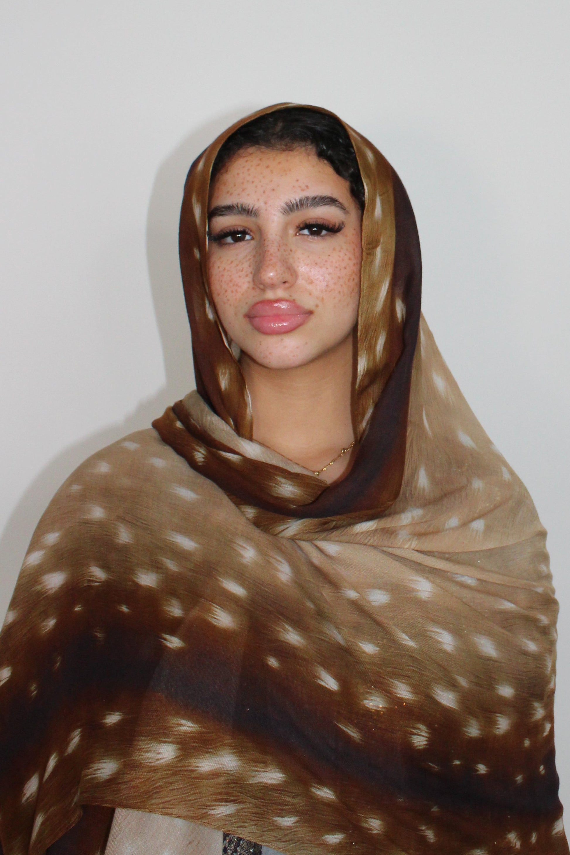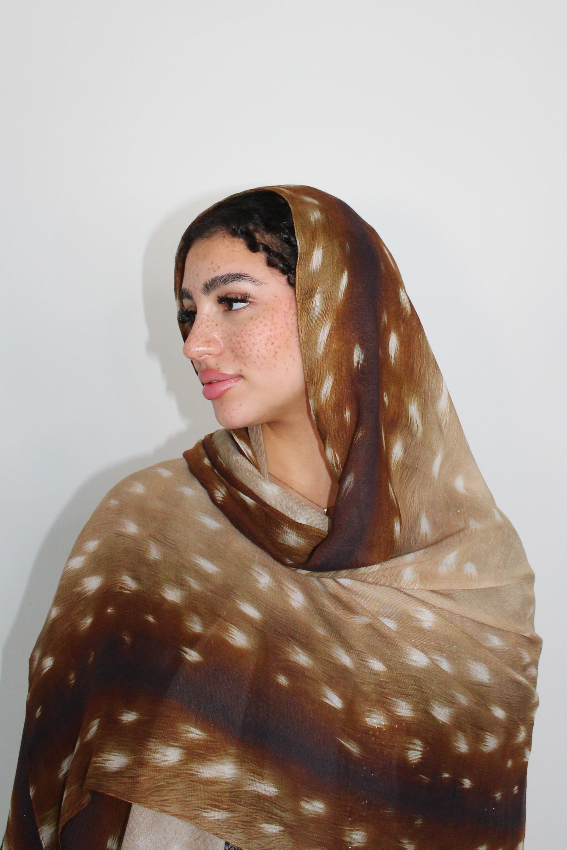 Our soft, flowy modal hijab in a warm caramel tone, featuring a refined deer-inspired print—an evolution of our Bestselling Bambi design.